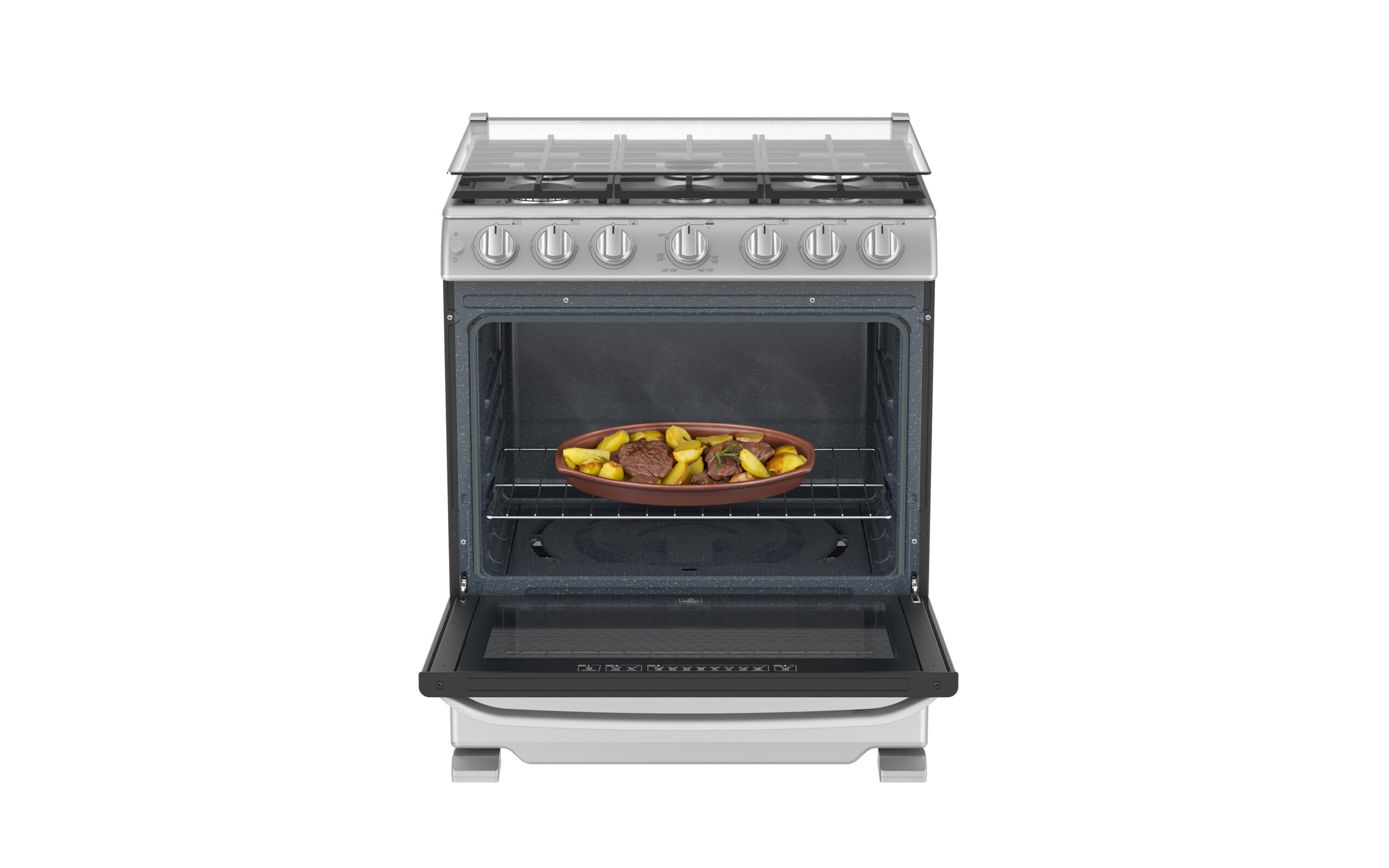 MABE ESTUFA GAS 30″, COLOR PLATA MERCURY, 6Q (2 JUMBO), CAPELO, CUBIERTA SELLADA INOX, PARRILLAS DE FUNDICION, ENCENDIDO ELECTRÓNICO POR BOTON, VENTANA PANORAMICA.